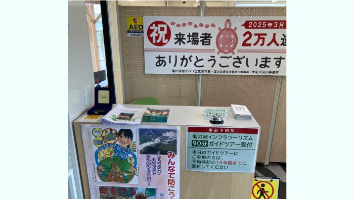 亀の瀬地すべり歴史資料室内の窓口にお越しください。ツアー開始時間の10分前までに必ず受付をお済ませください。遅れた場合、ツアーに参加できないことがありますので、余裕を持ってご来場ください。