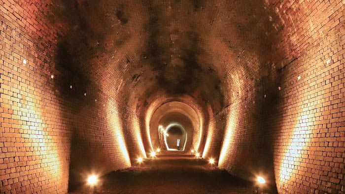 「水を抜く(排水トンネル)」の工事中に偶然発見された「旧大阪鉄道亀瀬隧道」を見学し、プロジェクションマッピングを観覧
