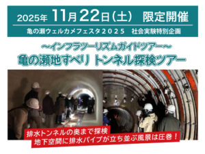 亀の瀬ショートツアーとして「亀の瀬地すべり歴史資料室」・「1号排水トンネル」・「旧大阪鉄道亀瀬隧道」などをご案内します。【事前申込制】